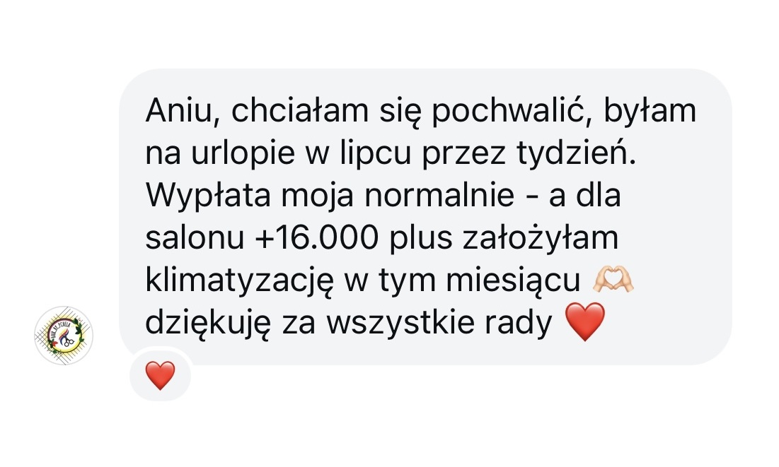 Pracowała 10 godzin dziennie, 6 dni w tygodniu, a na koncie zostawało tyle, że nie była zadowolona. Już po drugim miesiącu podniosła ceny, przestała pracować w soboty i… nikt nie uciekł. A to była jej główna obawa i dlatego właśnie sama zaniżała swoją pracę, dając zły przykład dziewczynom w salonie. W lipcu — miała swoją regularną wypłatę jako Fryzjerka, wakacje, remont w salonie i 16.000 zł czystego zysku z firmy.